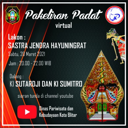 secara virtual pada hari Sabtu tanggal 21 Maret 2021, pukul 20.00 - 22.00, bersamaDalang Ki Sutardji dan Ki Sumitro di channel youtube Dinas Pariwisata dan Kebudayaan Kota Blitar.